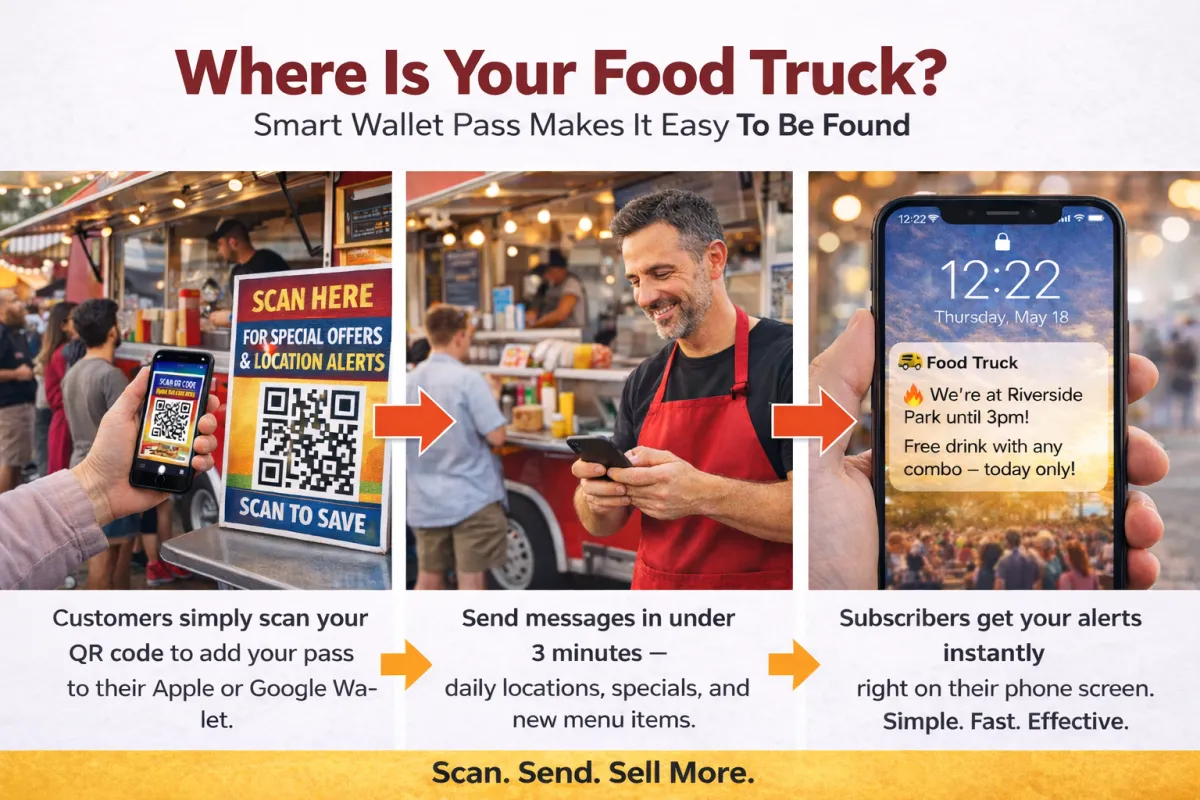 At a busy food truck festival, it can be hard for customers to find you among dozens of trucks. With Smart Wallet Pass, visitors can quickly join your list by scanning your QR code.